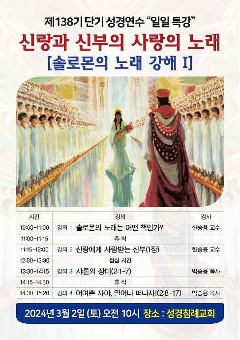 3월 2일(토) 오전 10시 성경침례교회에서 <솔로몬의 노래 강해>를 진행합니다.