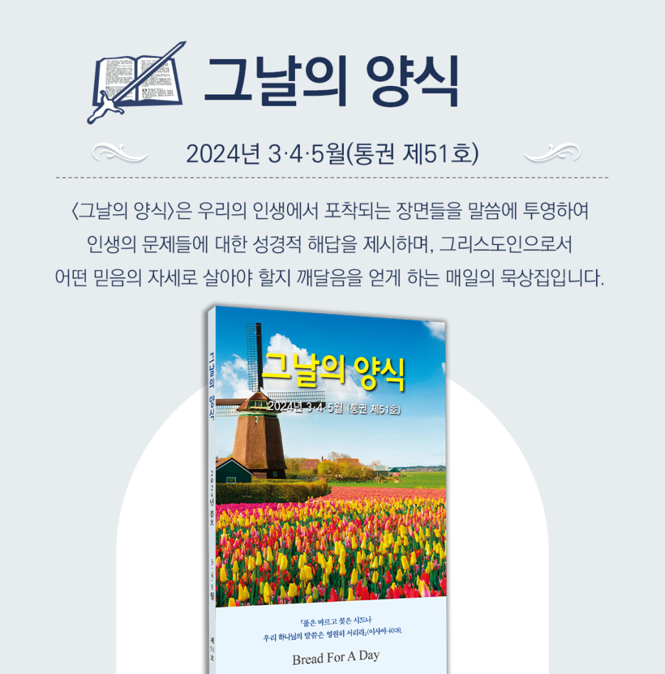 <그날의 양식>은 예수 그리스도의 피로 구속받은 성도가 진리의 지식으로 성장하여 주님과 교제할 수 있도록 도와주는 영적 생명의 양식입니다. 개인, 직장, 학교, 교회들에서 경건의 시간을 위해 활용할 수 있습니다.